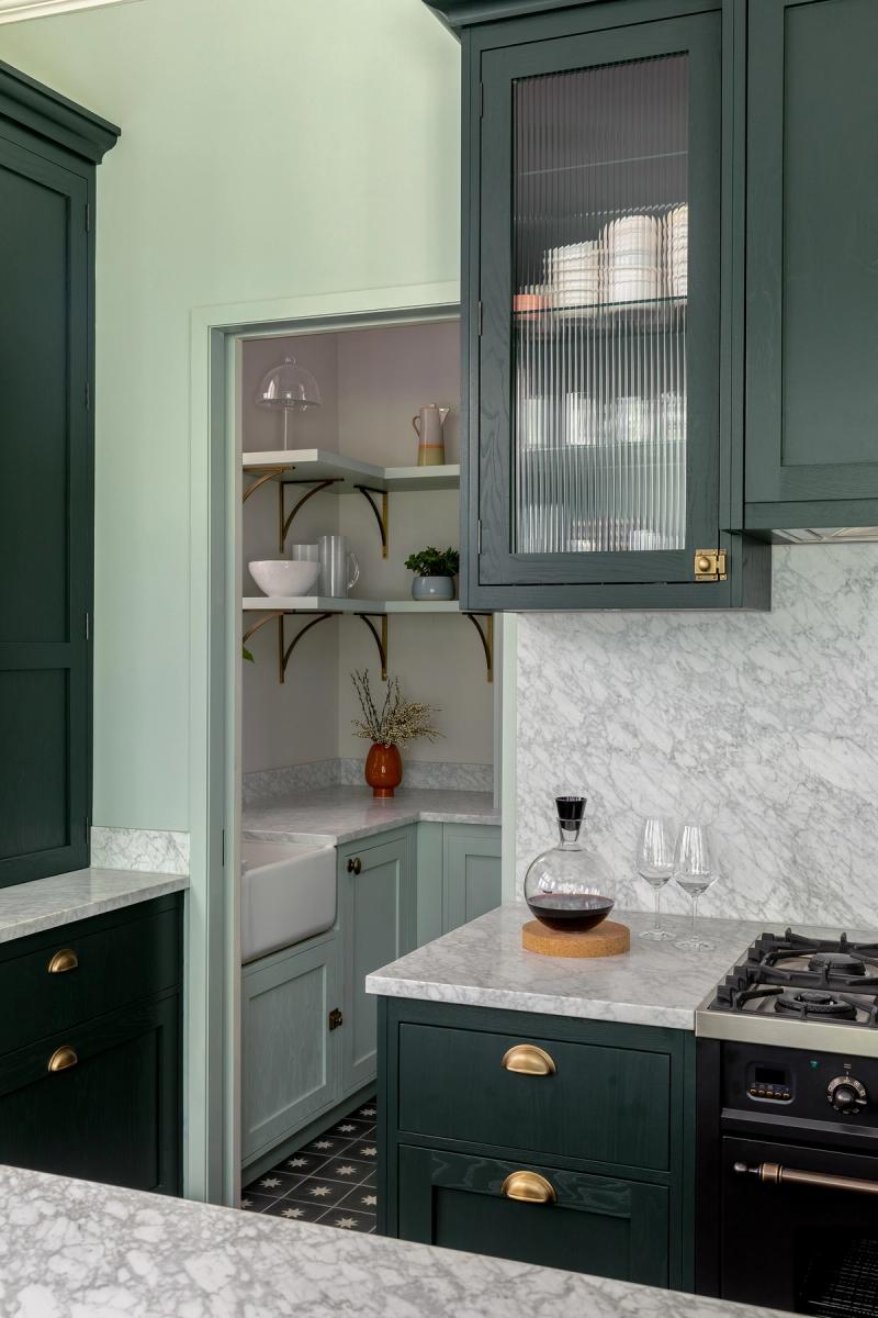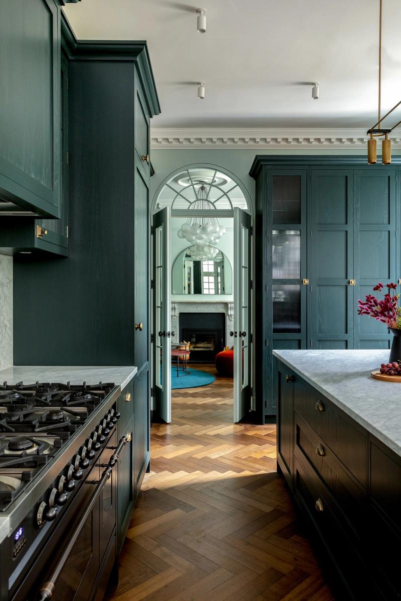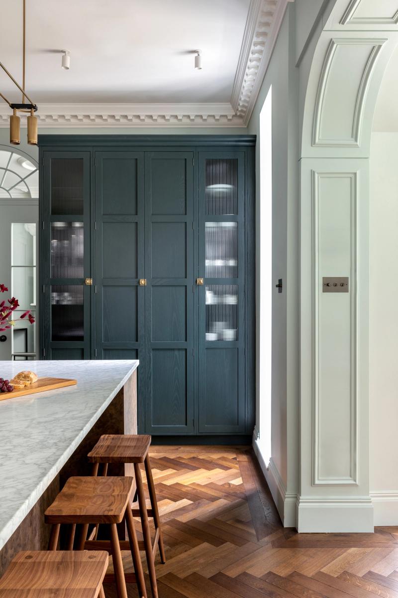 We kept to few materials in the kitchen – walnut interiors for the drawers and cabinets, dark wooden traditional herringbone patterned flooring to tie in with the walnut interiors, marble for the worktops and splashbacks to include the work surfaces inside the pantries and the back kitchen, bronze handles and knobs, bronze taps, bronze knobs on the range, bronze pendant light fitting above the kitchen island, we added the bronze on the side of the island facing the dining area to pull the scheme together and to make the view from the dining area a little different from the dark painted wooden doors and drawer fronts of the rest of the kitchen. It was to create more interest whilst sticking to the few selected material.