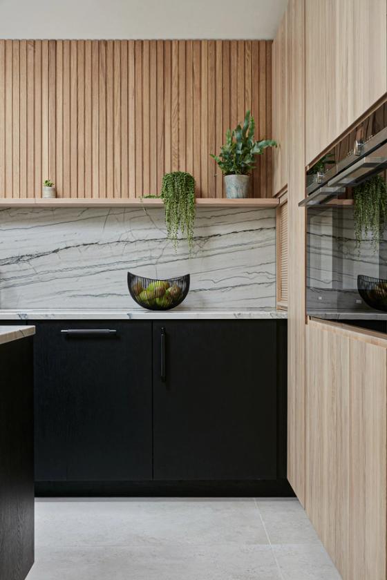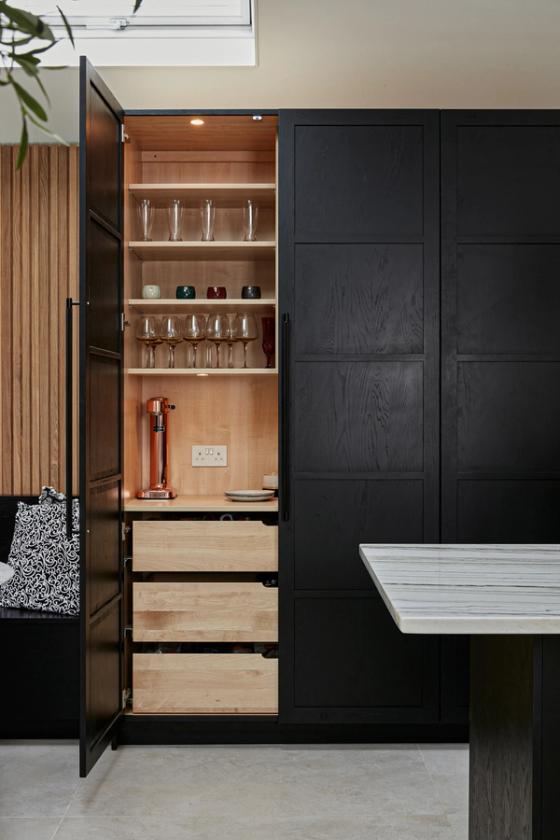 The designer's solution embraces biophilic principles, fostering a connection to nature and creating an indoor-outdoor ambience. Flat-fronted cabinetry in ash, hand-painted in matt black, demarcates the backbone of the kitchen, while pale oak panels with handcrafted fluted surfaces line the walls. At the heart of the design is a marble-topped island, featuring seating thoughtfully arranged around one corner and integrated with a downdraft Bora system. The working side offers push-to-open drawers lined with bespoke organisers, while open shelves on the front provide space for display and cookery books.