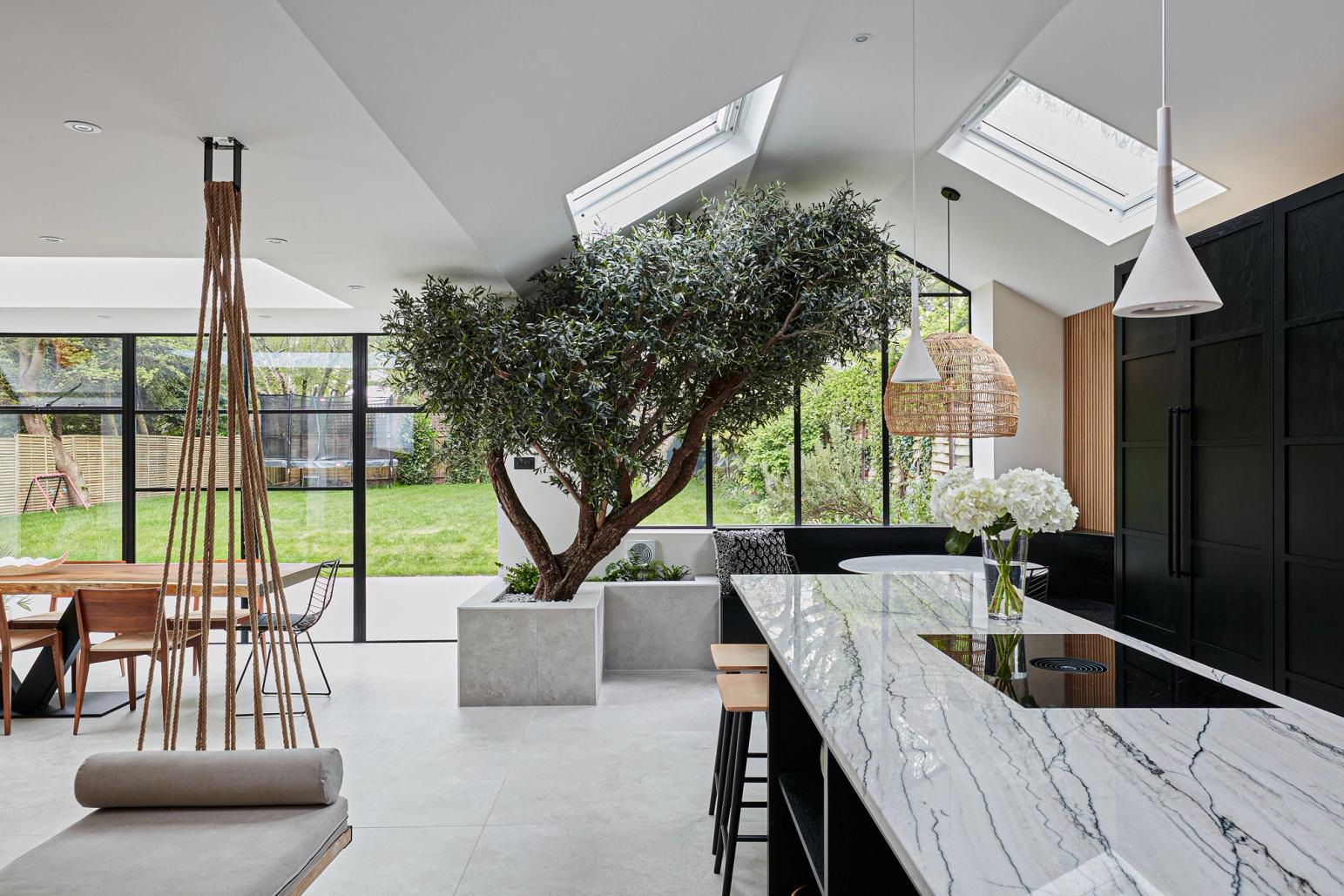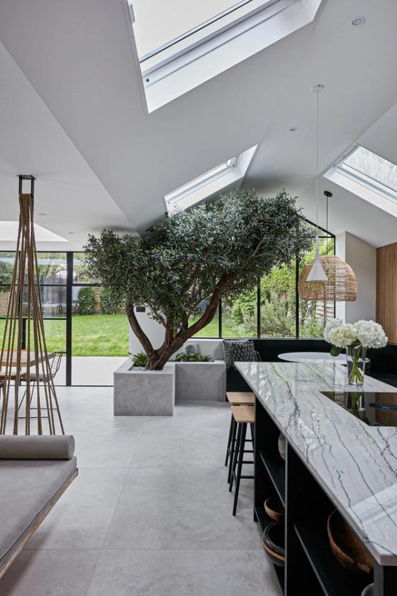 Finishing touches: the built-in planter for the ancient olive tree was designed with walls suitable for perching on. In the corner, to the right of sink, a countertop cabinet with a rolling door and a power socket fitted inside means gadgets such as the mixer can easily be pulled out for use before sliding away again.