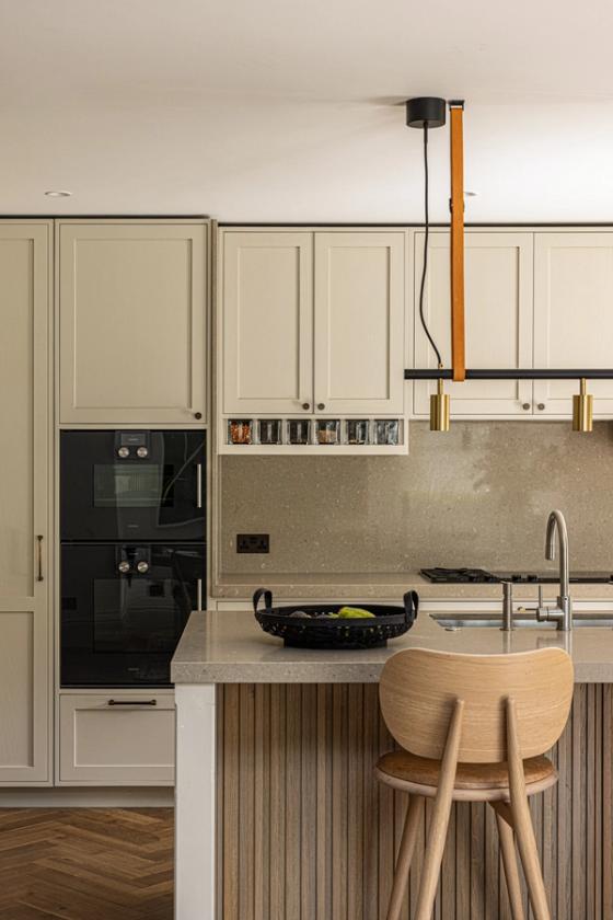 The designer's solution combines painted, in-frame Shaker cabinetry along the perimeter with Shitake quartz worktops by Caesarstone, paired with the distinctive slim slats of Sola Kitchens’ Skog cabinetry on the island front to create a look that is both contemporary and classic. Originally planned as a U-shaped layout around the island, the design was reconfigured when the owners opted to replace an existing window with French doors to provide direct garden access. This change prompted the relocation of the sink — now complete with a Barazza tap and soap dispenser — to the island, while the glass-fronted pantry now reads as a freestanding piece of furniture positioned elegantly between the two doorways.
